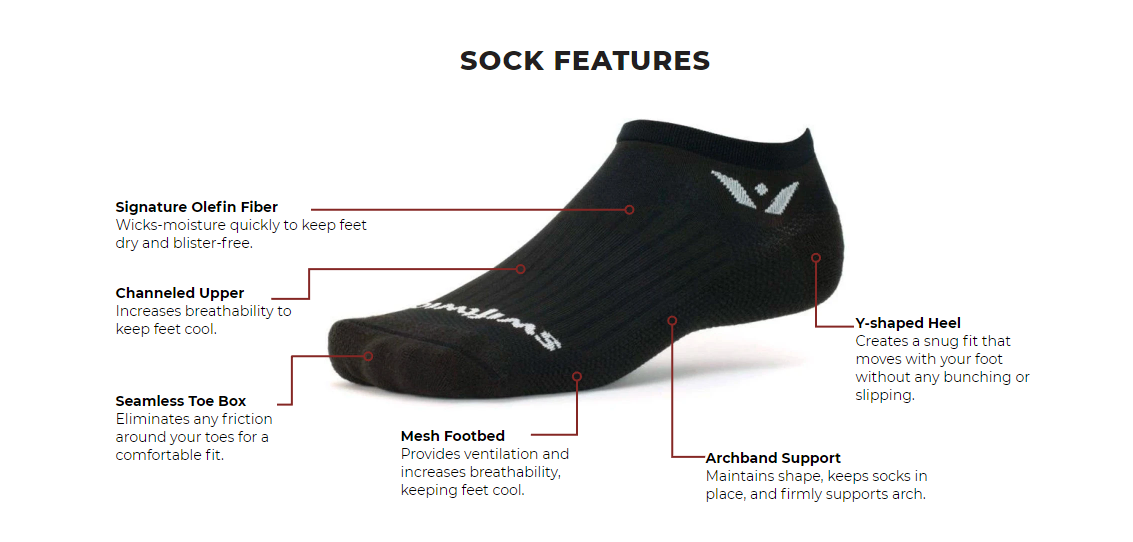Swiftwick VIBE™ is a versatile medium cushion, moderate compression sock that adapts to the demands of your performance lifestyle. VIBE™ is built with high Olefin content in the footbed for optimum moisture control. Seamless Toe is critical for everyday performance wear with a virtually invisible toe seam to eliminate the potential for blisters in the toe box. Zero cuff height sits below the ankle with minimal extension above the shoe.