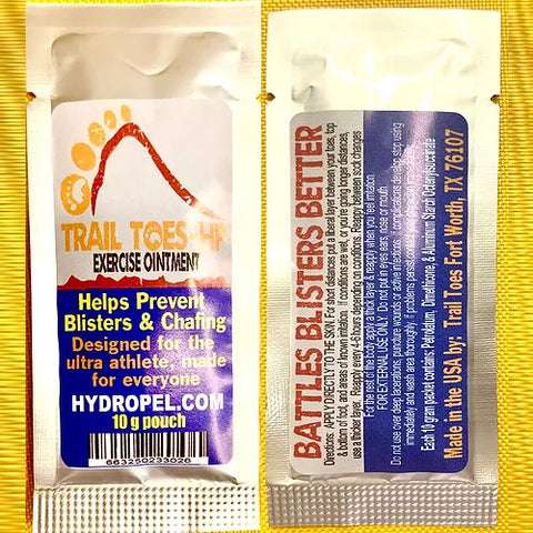 Trail Toes HP is a maximum strength skin protectant petroleum and dimethicone-based exercise ointment that will soon become your favorite foot and body lube of choice. It goes on thick and stays that way for hours, only requiring minimal reapplication. It is unparalleled at reducing friction and shear, which will help to eliminate abrasions, blistering, and chaffing, even under the harshest of conditions. It repels water while allowing the underlying skin and tissue to stay moist and pliable